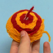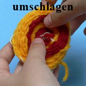 Wie im Folgenden gezeigt, wird ein neuer Faden durch eine der (in unseren Bildern) weißen Schlaufen gezogen. Es sind die Schlaufen, die vorher über die einzelnen Zacken des Webrahmens gespannt waren. Das Fadenende darf jedoch nicht ganz hindurchgezogen werden, da es später noch benötigt wird. Anschließend wird dieser Faden nun immer abwechselnd durch eine Schlaufe der einen Hälfte und dann durch eine Schlaufe der anderen Hälfte gezogen, sodass der Faden zwischen beiden Hälften im Zickzackmuster verläuft. Es sollten alle Schlaufen nach der Reihenfolge verwendet werden.