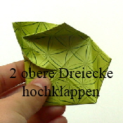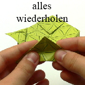 In Schritt 14 muss man sich das Stück, deren Spitze nach unten geknickt wird, vorstellen wie ein Dreieck. Dieses darf nicht über die Ecke des Quadrates (Grundform) hinaus geknickt werden. Danach drückt man die in Schritt 13 gut zu erkennenden Dreiecke mit den Daumen nach unten, bis sie auf der anderen Seite des Ganzen den Mittelpunkt erreichen (in Schritt 17). Das ganze noch einmal mit Grafiken - hat man den Vorgang erst einmal verstanden, ist das Falten der Seerose kinderleicht: