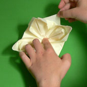 Mit dem Zeigefinger müssen nun permanent die in der Mitte zusammenführenden Serviettenteile fixiert werden. Die zwei Ecken jedes Seerosenblütenblattes werden leicht umgeschlagen, damit jedes Seerosenblatt ordentlich entfaltet werden kann. Dazu zieht man an der Spitze des Blattes und drückt währenddessen leicht auf dessen inneren Teil.